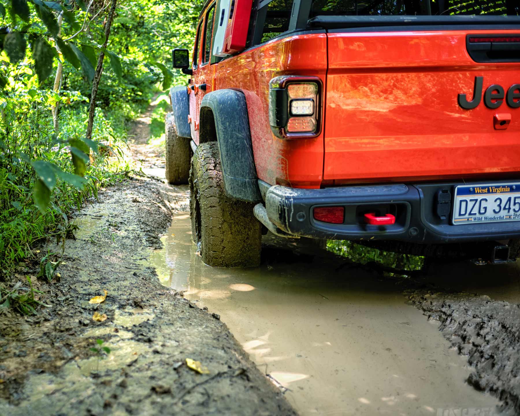 While much of the trail is very similar, there are a few points of interest. We encountered a couple of minor water crossings but nothing that would cause issues. We came across Huey Cemetery, which looked seldom visited but still had a newish sign so it seems someone still has an interest in it. I couldn’t locate any information on it as there seem to be numerous cemeteries in the area with Huey in the name. I’d like to go back and explore this spot a little more and see if there is anything I can get information on. You also have a few spots crossing power lines where the view opens up and you can see the surrounding area a bit more. We always take these opportunities to pull out the drone to explore. Towards the beginning of the trail, there is a mud pit that was slightly deeper than expected. I don’t have the biggest Gladiator in the world but with 37” tires and a 3” lift it isn’t small and the water was over my rear bumper. I didn’t need any recovery gear but it did take a bit of back and forth to get out.